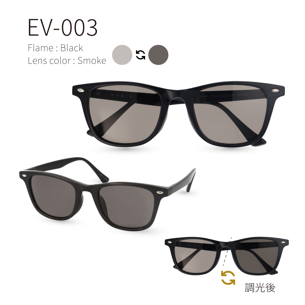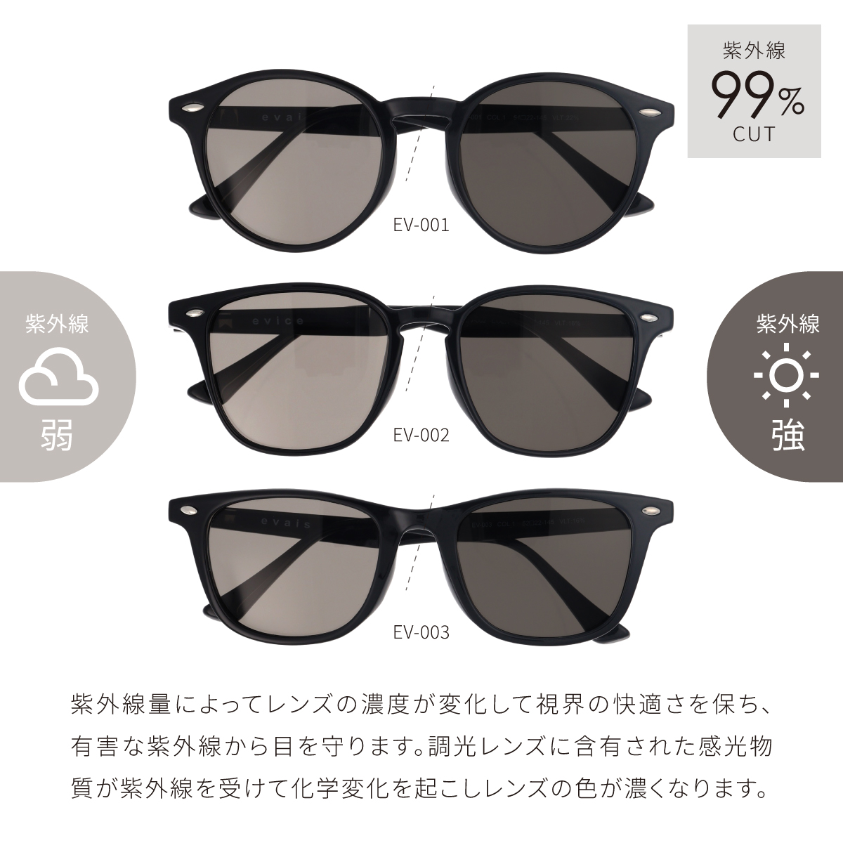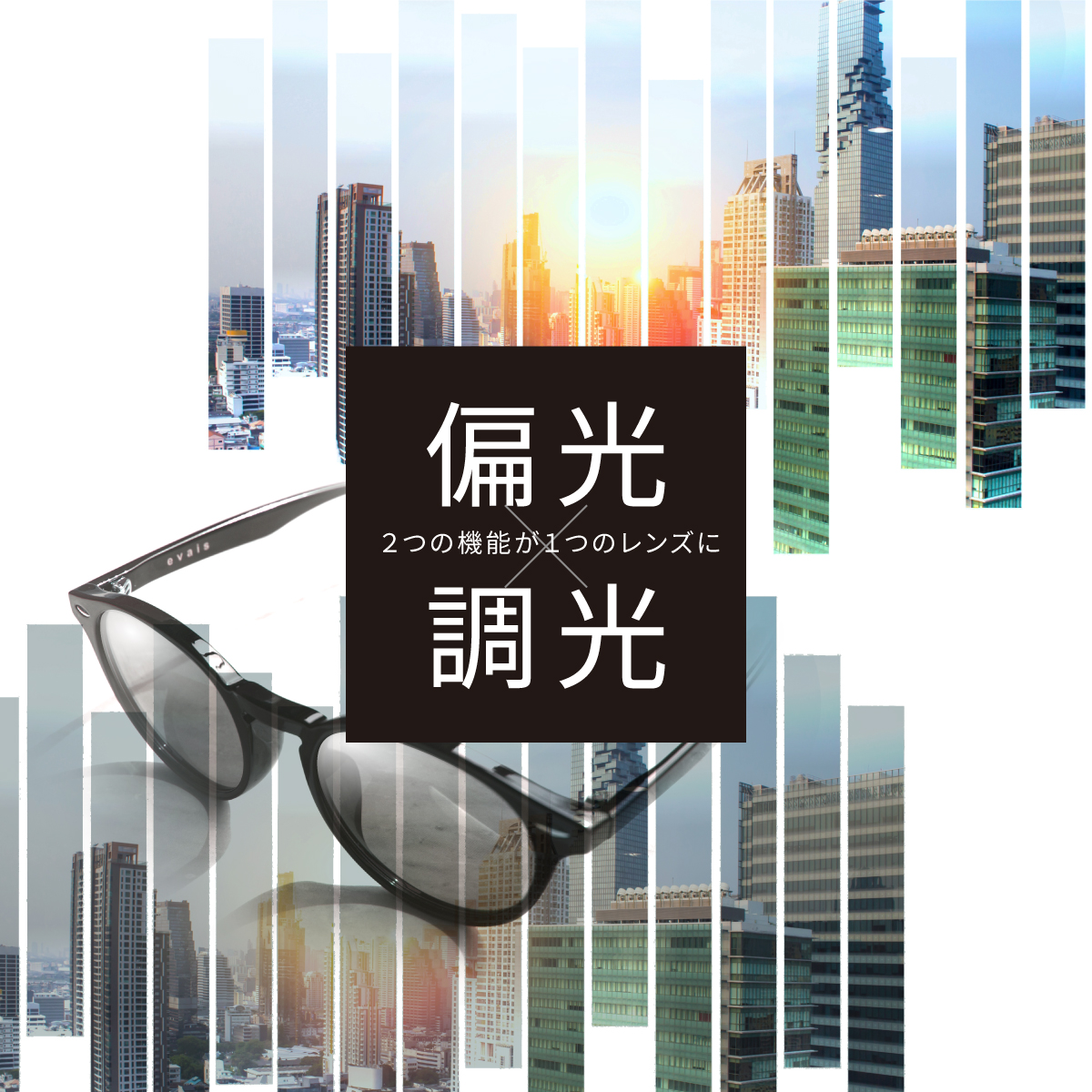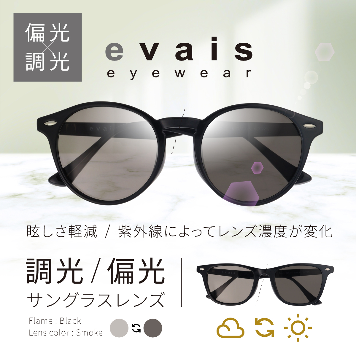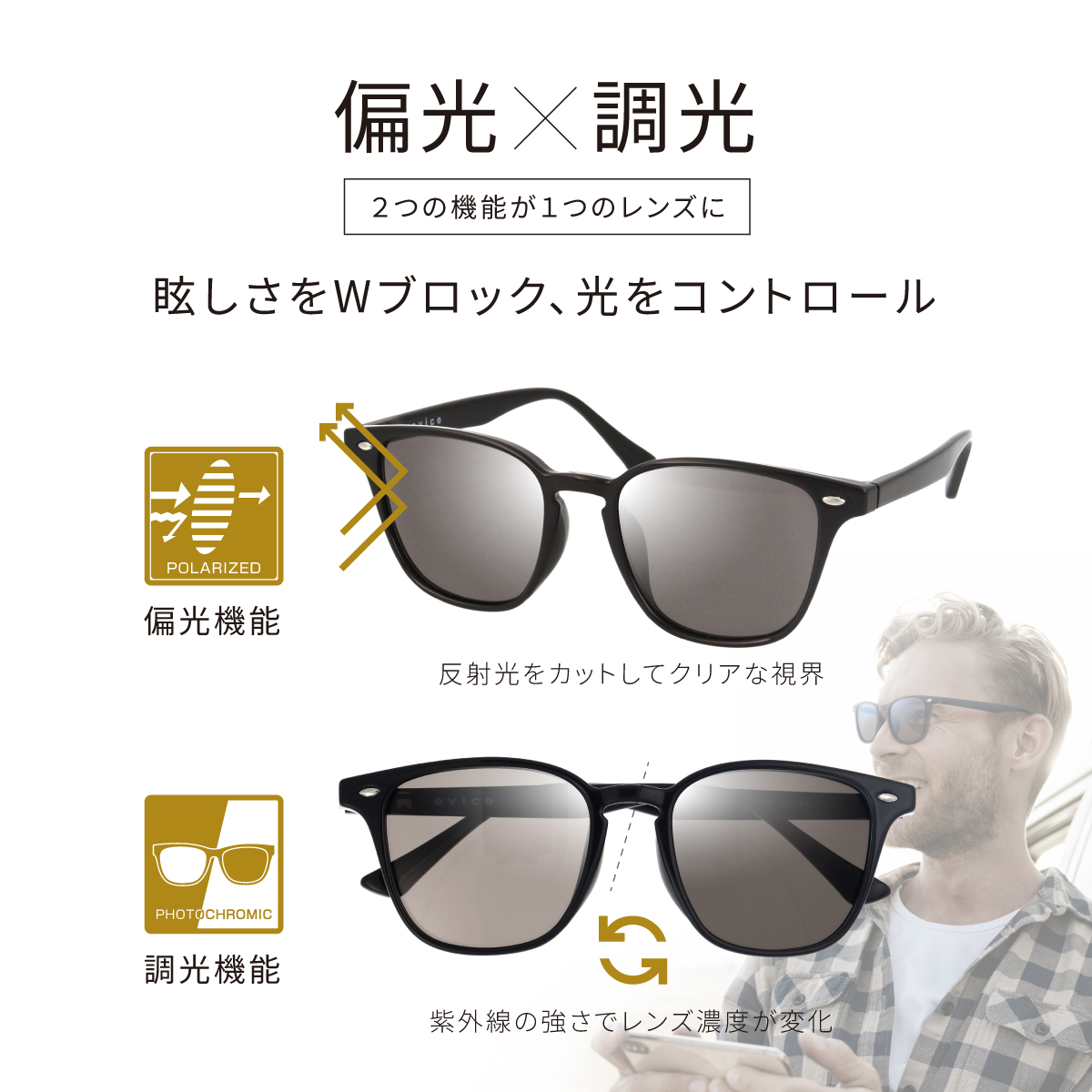 「サングラスをかけると視界が暗すぎる」「室内に入るたびにかけるのが面倒」そんな悩みを解決するのが、evais(エヴァイス)の偏光調光サングラスです。王道の黒縁(くろぶち)フレームを採用し、どんな顔立ちやファッションにも馴染む洗練されたデザインに、様々なシーンに合わせたレンズ機能を凝縮しました。