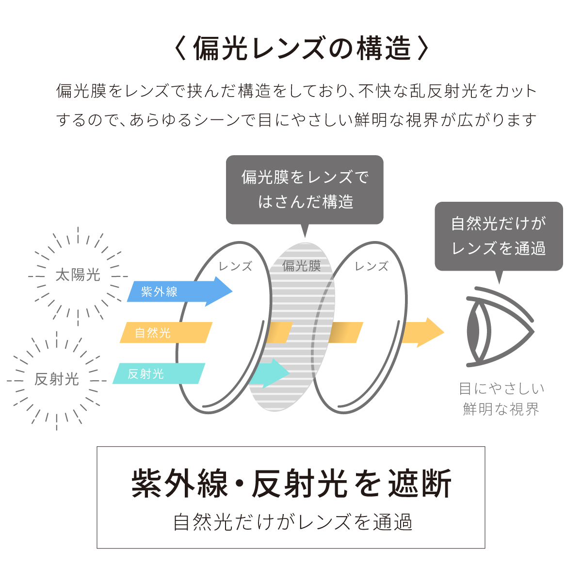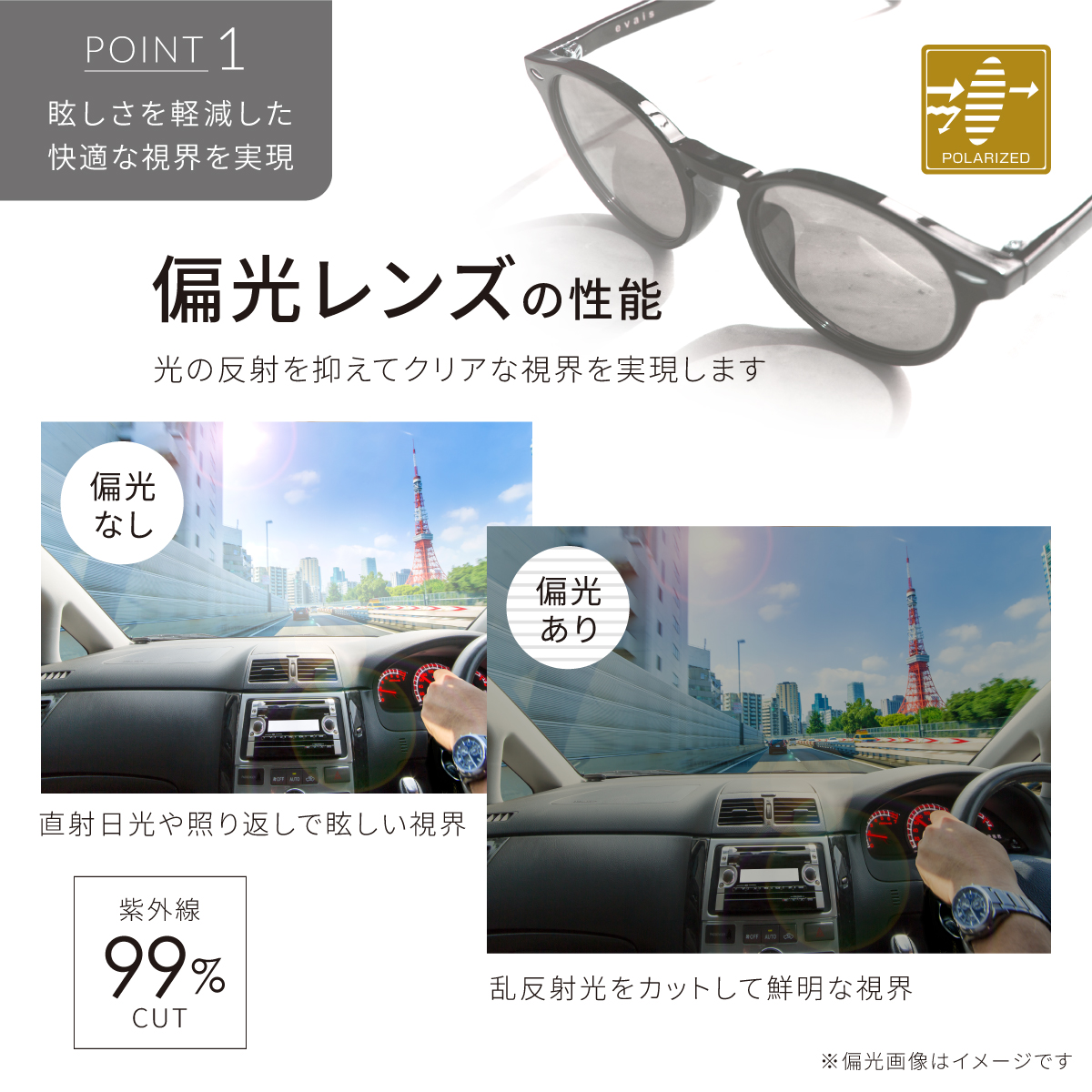 偏光機能は、路面や水面、フロントガラスの反射(グレア)を効率よくカットします。釣りでの水中確認や、ドライブ中の眩しさ軽減に圧倒的な威力を発揮し、目の疲れを最小限に抑えます。
