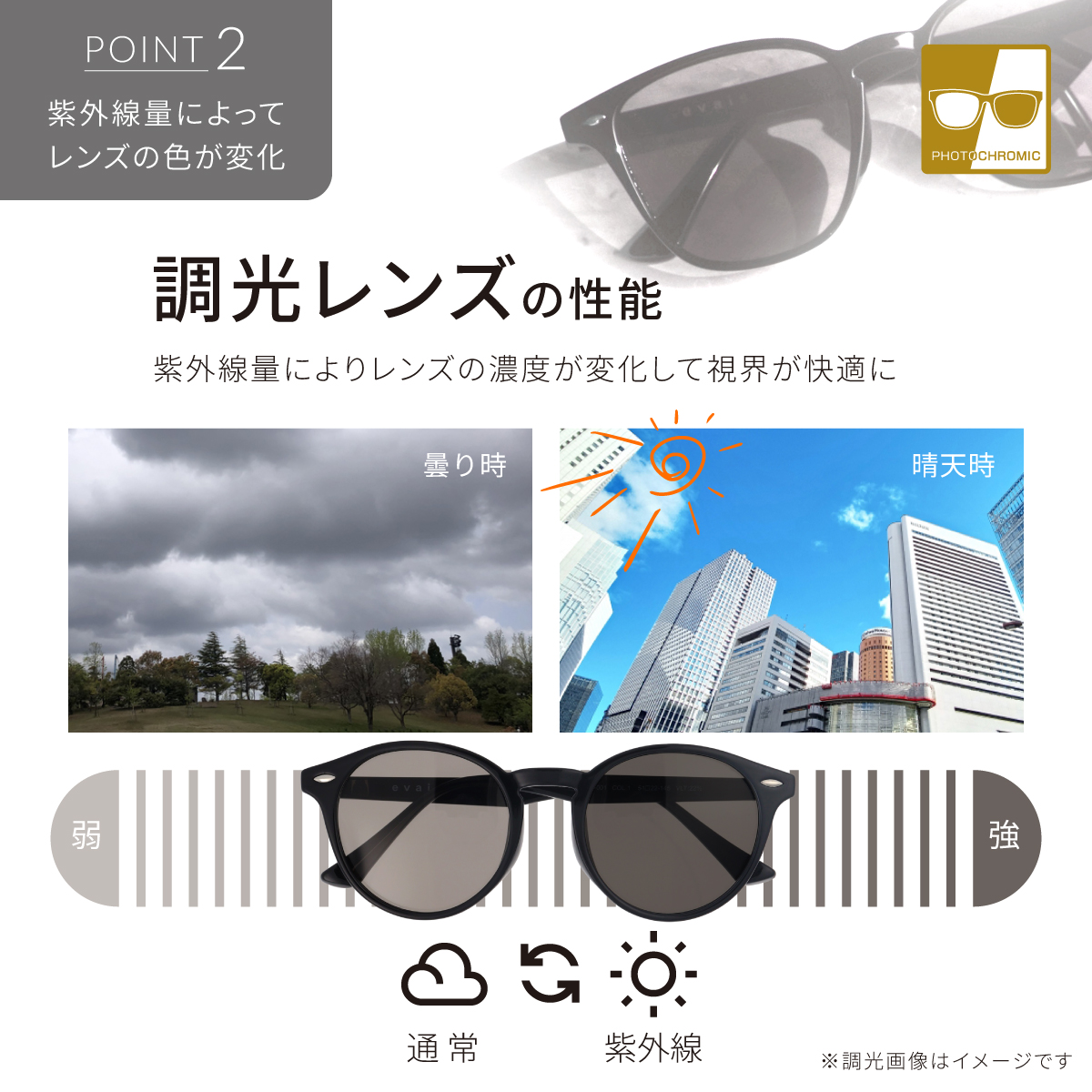 調光機能は、紫外線量に合わせてレンズの色が自動で変化します。屋外では濃い色のサングラスとして、屋内やトンネル内ではクリアに近い視界へスムーズに切り替わるため、一日中かけたままで過ごすことができます。